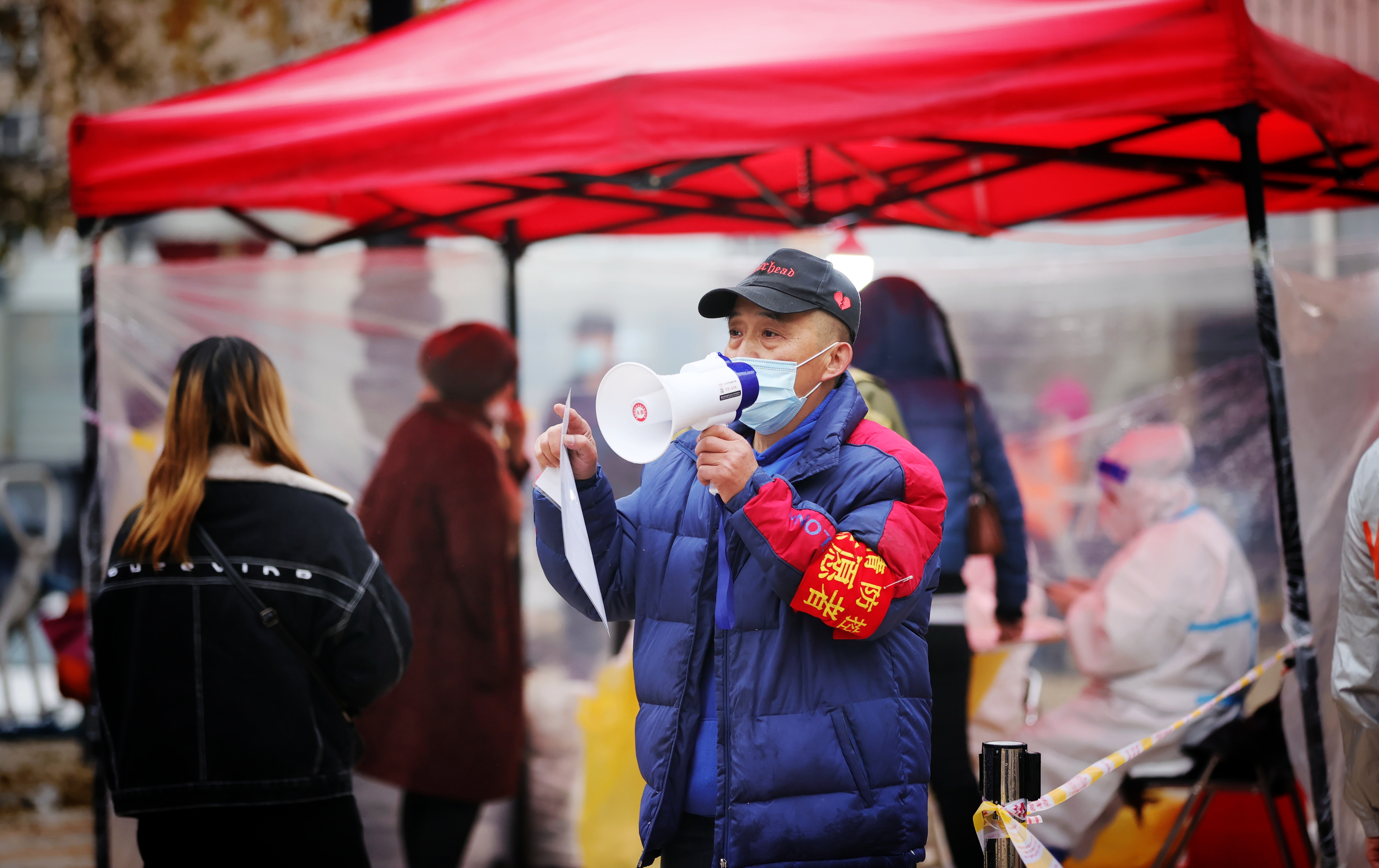 在埃德蒙頓路祥泰人家小區(qū)廣場核酸檢測取樣點,轄區(qū)居民響應政府號召,有序冒雨排隊等待核酸檢測取樣。附近的商家給工作人員送來燒好的熱水,感謝這些在冰雨中無私奉獻的工作人員。