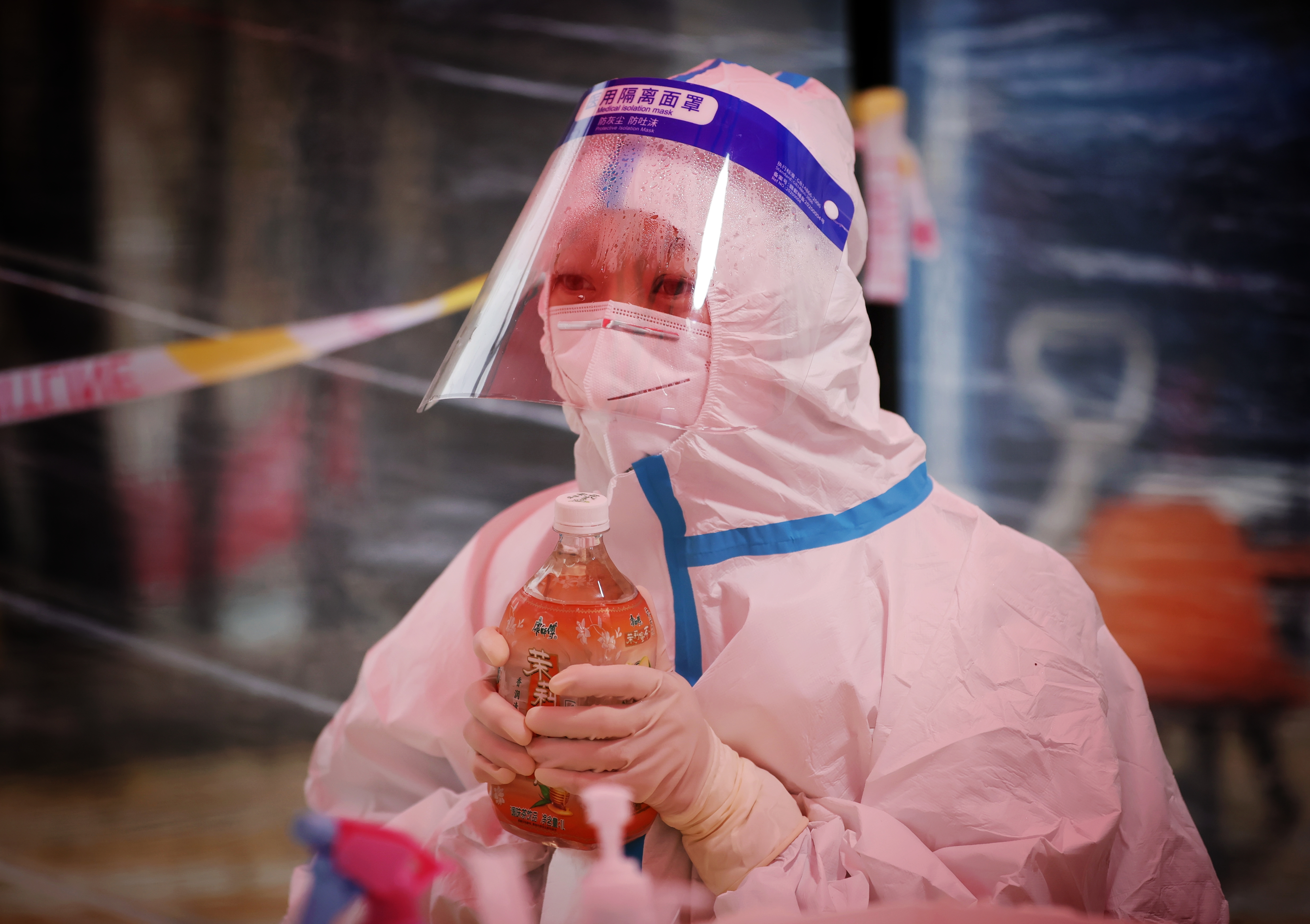 醫(yī)護人員用裝熱水的飲料瓶溫暖一下雙手